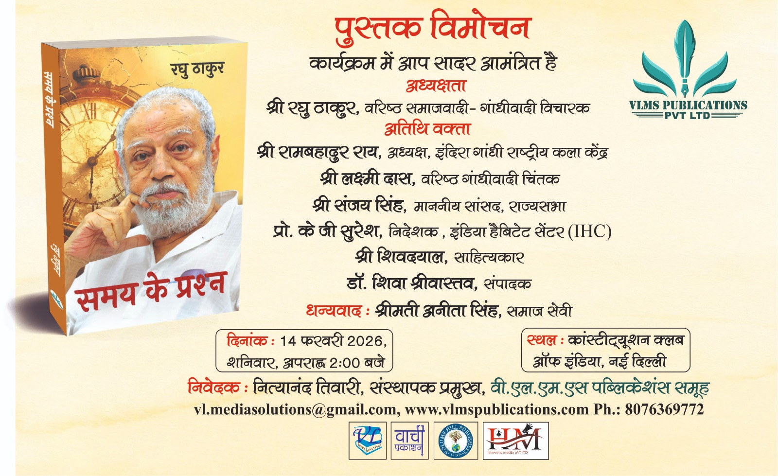 उक्त जानकारी वी.एल.एम.एस. पब्लिकेशन्स समूह के संस्थापक प्रमुख नित्यानन्द तिवारी ने देते हुए बताया कि वरिष्ठ सजावादी रघु ठाकुर की रचित पुस्तकों के क्रम में पुनः एक नई पुस्तक ‘‘समय के प्रश्न’’ का विमोचन कल 14 फरवरी 2025 दिन शनिवार अपरान्ह 2 बजे नई दिल्ली स्थित कांस्टीट्यूशन क्लब ऑफ इण्डिया में किया जाएगा। उक्त कार्यक्रम में अतिथि वक्त के रूप में रामबहादुर राय, अध्यक्ष इंदिरा गांधी राष्ट्रीय कला केन्द्र, लक्ष्मी दास वरिष्ठ गांधीवादी चिंतक, संजय सिंह, सदस्य राज्य सभा, प्रो0 के0जी0 सुरेश, निदेशक इंडिया हेबिटेट सेन्टर, शिवदयाल साहित्यकार व डा0 शिवा श्रीवास्तव सम्पादक उपस्थित रहेंगे। कार्यक्रम की अध्यक्षता रघु ठाकुर द्वारा की जाएगी तथा समाजसेवी अनीता सिंह द्वारा धन्यवाद ज्ञापित किया जाएगा।