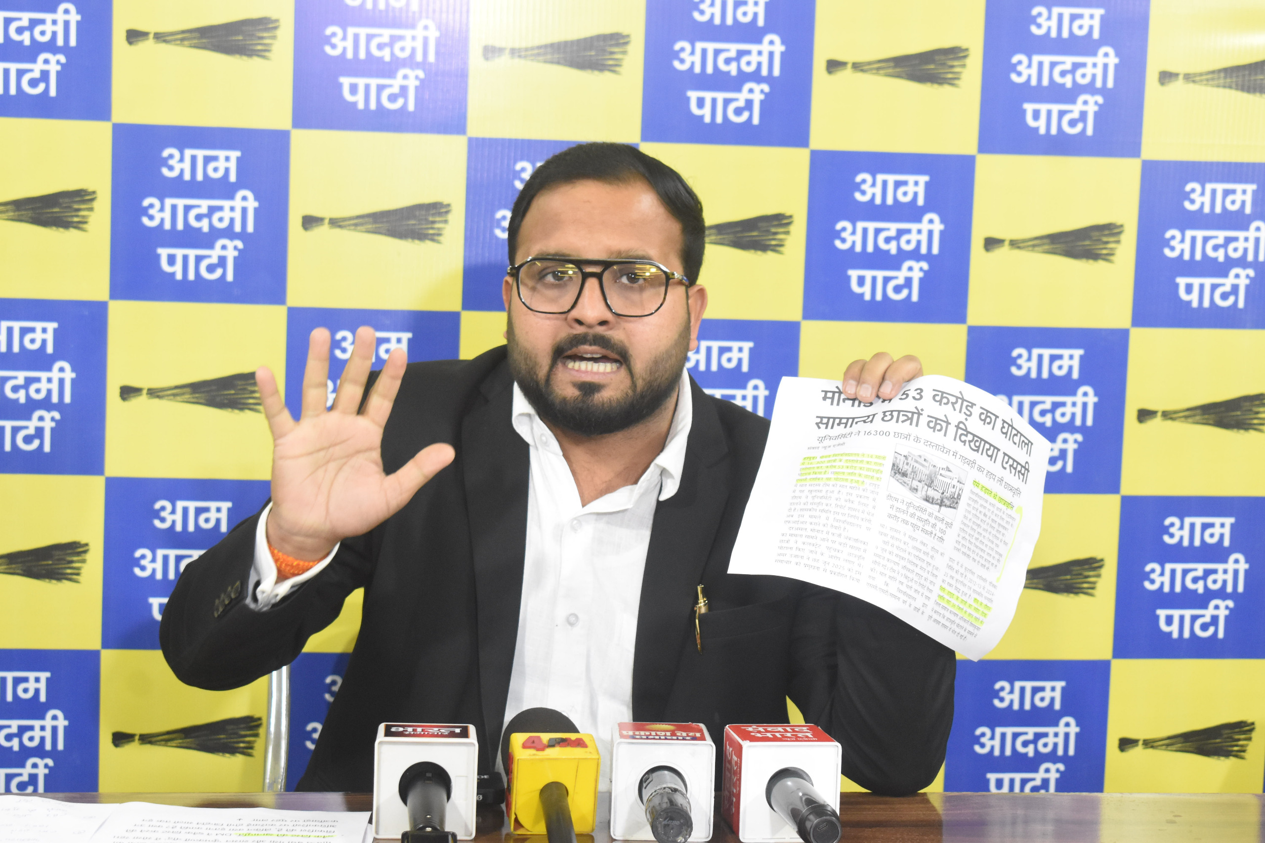 लखनऊ,आम आदमी पार्टी उत्तर प्रदेश के मुख्य प्रदेश प्रवक्ता वंशराज दुबे ने शुक्रवार को प्रदेश मुख्यालय पर आयोजित प्रेस वार्ता में उत्तर प्रदेश में हुए एक बड़े छात्रवृत्ति घोटाले का खुलासा करते हुए कहा कि प्रधानमंत्री नरेंद्र मोदी और मुख्यमंत्री योगी आदित्यनाथ “सबका साथ–सबका विकास” की बात करते हैं, लेकिन हकीकत यह है कि उत्तर प्रदेश में छात्रों का विनाश और कुछ गिने-चुने कॉलेज व विश्वविद्यालय मालिकों का विकास हो रहा है। उन्होंने कहा कि हापुड़ स्थित मोनाड विश्वविद्यालय में सामने आया यह घोटाला उसी सच्चाई को उजागर करता है।